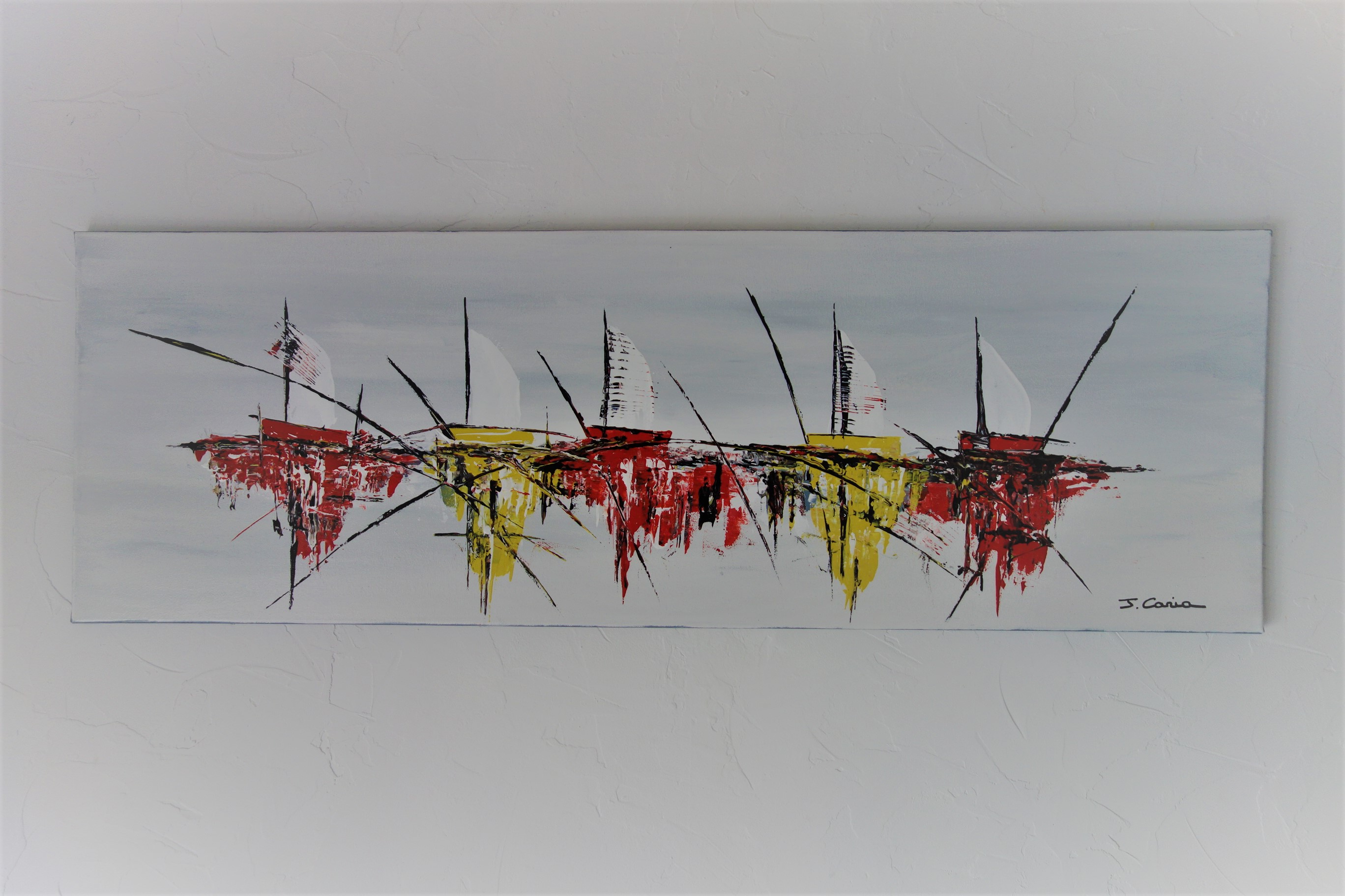Ce nouveau tableau de bateaux jaunes et rouges sur fond gris et blanc invite à l’évasion, au voyage, au calme, à la quiétude…