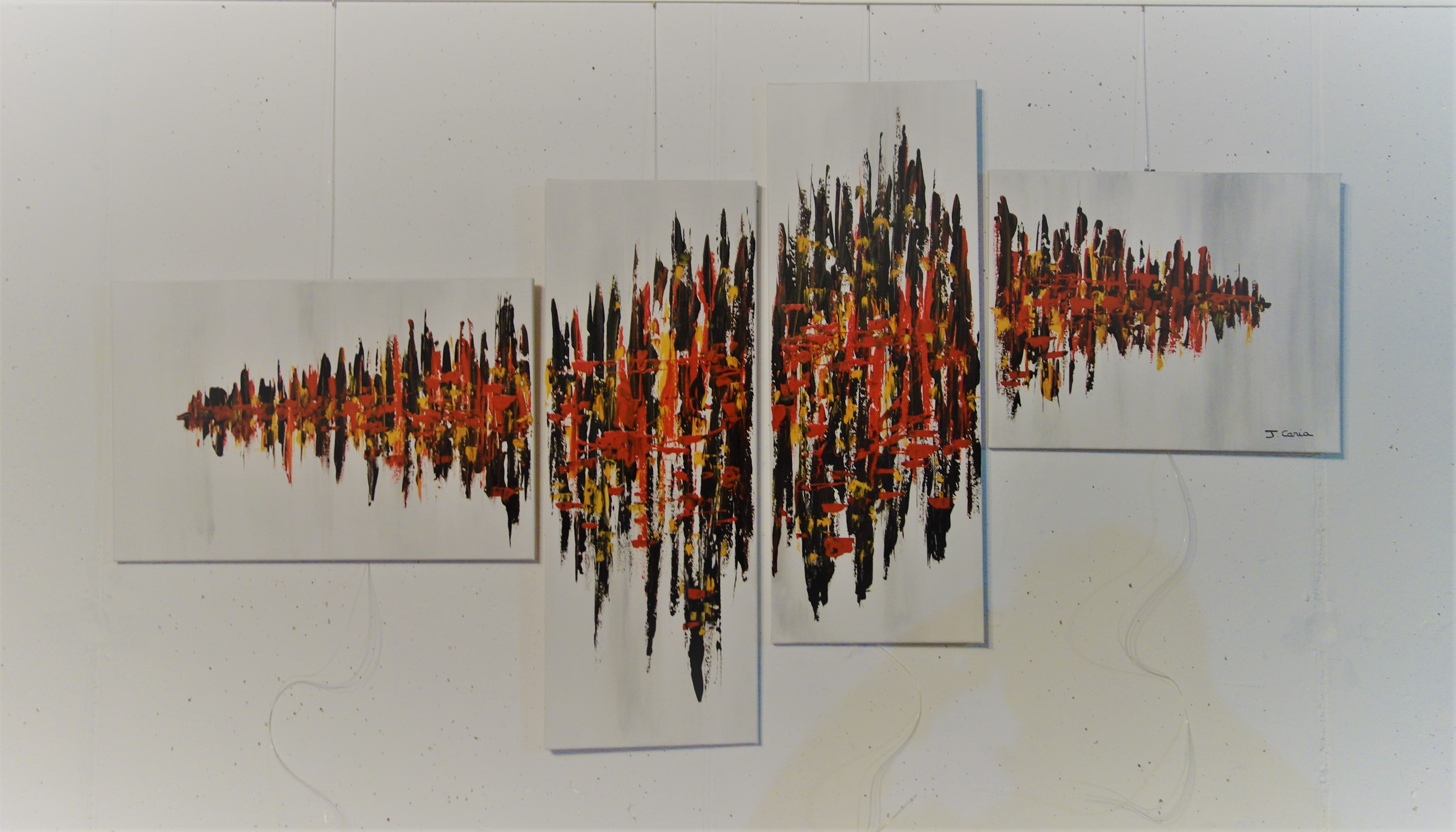 Pour poser le quadriptyque abstrait, il est important de s'assurer que la longueur totale de tous les panneaux entre dans les dimensions de votre mur, en tenant compte de l'espace entre chaque panneaux. On laisse en générale un espace entre 2 et 3 centimètres.